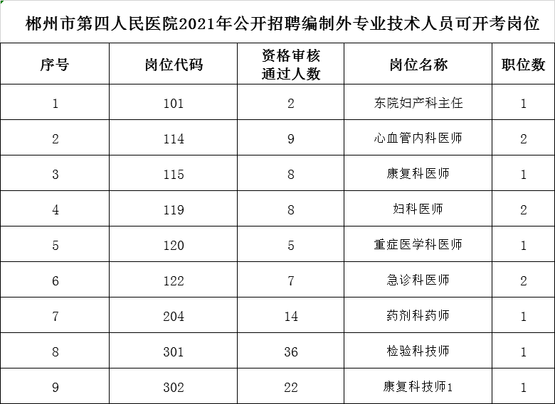 《郴州市第四人民医院2021年公开招聘编制外专业技术人员公告》于2021年6月3日在郴州市第四人民医院网站公开发布。按照公告要求,6月3日至6月14日网上报名。根据网上报名及网上资格审查情况,经我院公开招聘工作领导小组研究决定,对无人报名和报名人数未达到开考比例的岗位取消岗位招聘。现将开考情况公告如下: 根据报名情况及招聘公告中的开考比例:101-102岗位招聘不设开考比例,103-127、201-204、301-303岗位计划招聘人数与报考人数不低于 1:3,以下岗位可开考,具体面试时间另行通知:
