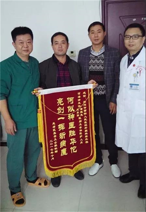 10月10日,患者匡某某的家属带着无比激动的心情,送来一面印有 “何似乎神仙胜华佗,亮剑一挥斩病魔” 锦旗,以表达他们对郴州市第四人民医院及肝胆外科感激之情。