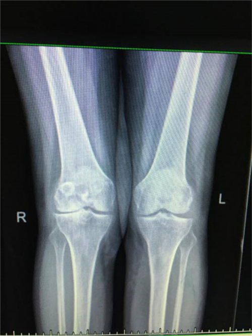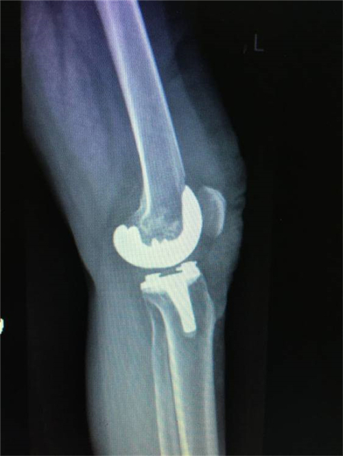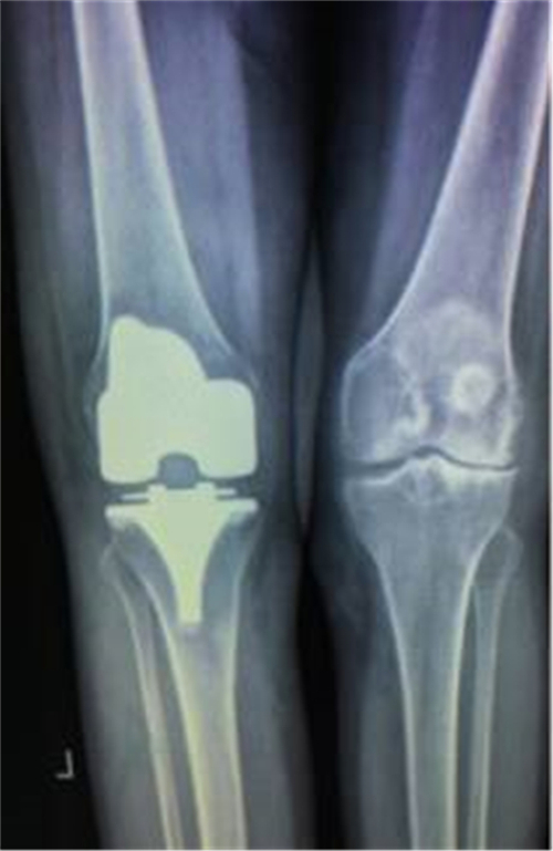 得知郴州市第四人民医院骨科掌握了这一手术技术,便前来就诊。谭主任接诊到该患者后,对其进行了详细的体格检查,发现其左膝关节僵直,屈伸活动不能,负重时膝关节疼痛明显加重,膝关节X线片提示膝关节退变严重,关节间隙明显变窄,并有游离体形成,诊断为左膝关节重度骨关节炎并关节僵直,有明确的膝关节置换手术指征。