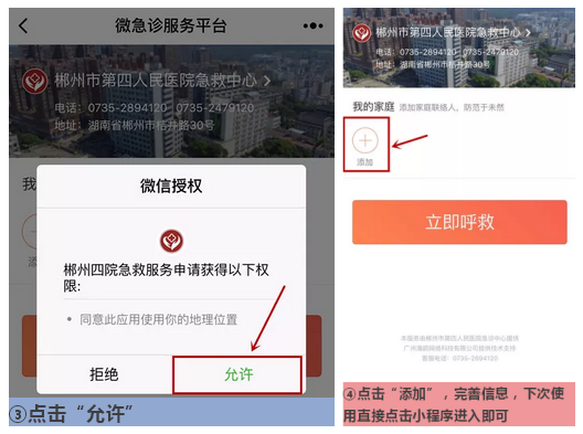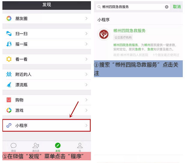 现小编呈上“微急救”使用流程,按以下操作就可以轻松体验这项便民服务啦! 一、关注使用 1 、关注方式一:进入我院 “郴州市第四人民医院” 公众号,点击医疗服务菜单里的“紧急呼救”