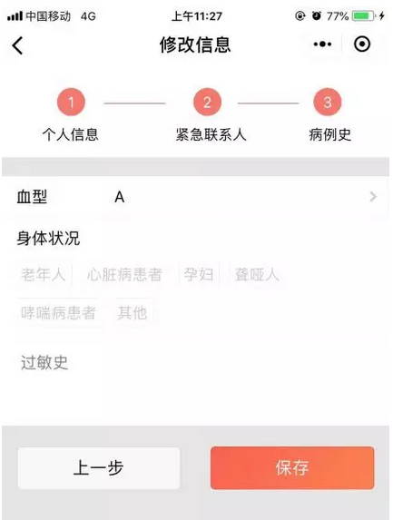 三、填写病例史信息:血型可选择填写 注意需填写真实的资料信息