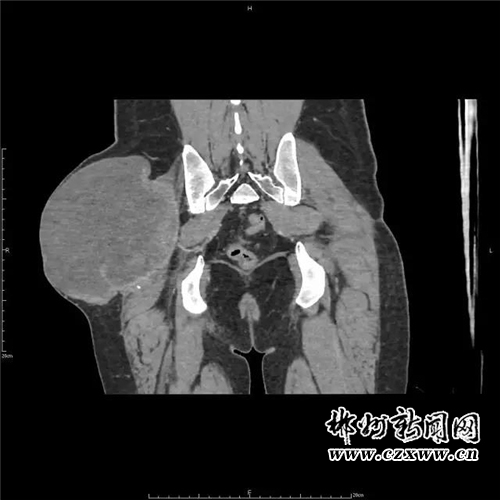 近日,患者感觉肿块突然增大并伴疼痛,觉得不能再耽搁了,遂抱以试试看的心态来我院就诊。入住普外科后,科主任李洪春主任医师亲自接诊并仔细为患者检查,患者右侧臀部外侧见约12*14*10cm大小肿物,不规则型,质软,压痛,活动欠佳,边界清,皮肤无溃烂。穿刺可抽出血性液体。立即予以完善臀部CT。