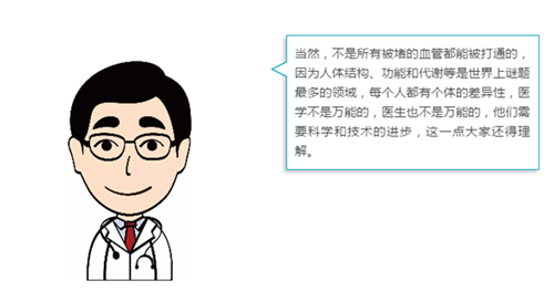 当然,不是所有被堵的血管都能被打通的,因为人体结构、功能和代谢等是世界上谜题最多的领域,每个人都有个体的差异性,医学不是万能的,医生也不是万能的,他们需要科学和技术的进步,这一点大家还得理解。