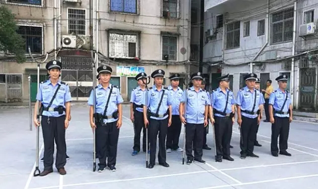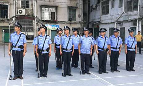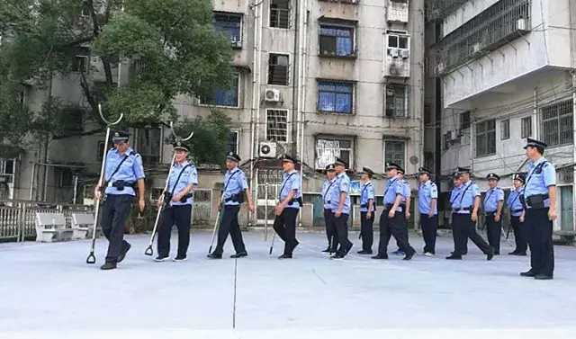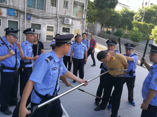 指导反恐警具的使用 正式演练前进行了严密的安排部署,苏仙派出所民警对保卫科工作人员的日常训练(包括列队、巡逻、引导手势)及反恐警具(警棒、腰叉、脚叉)的正确使用进行相关指导和培训。